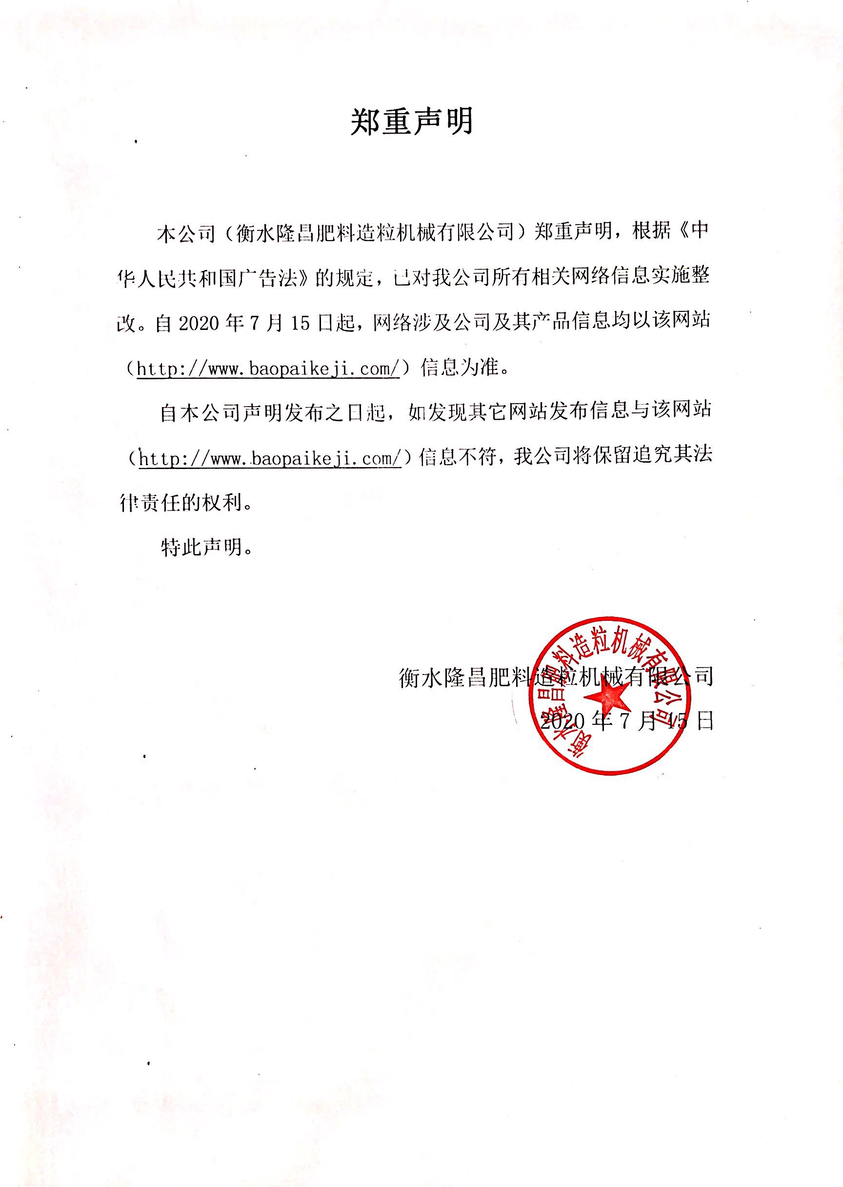 衡水隆昌肥料造粒機(jī)械有限公司對(duì)相關(guān)網(wǎng)絡(luò)信息實(shí)施整改的鄭重聲明